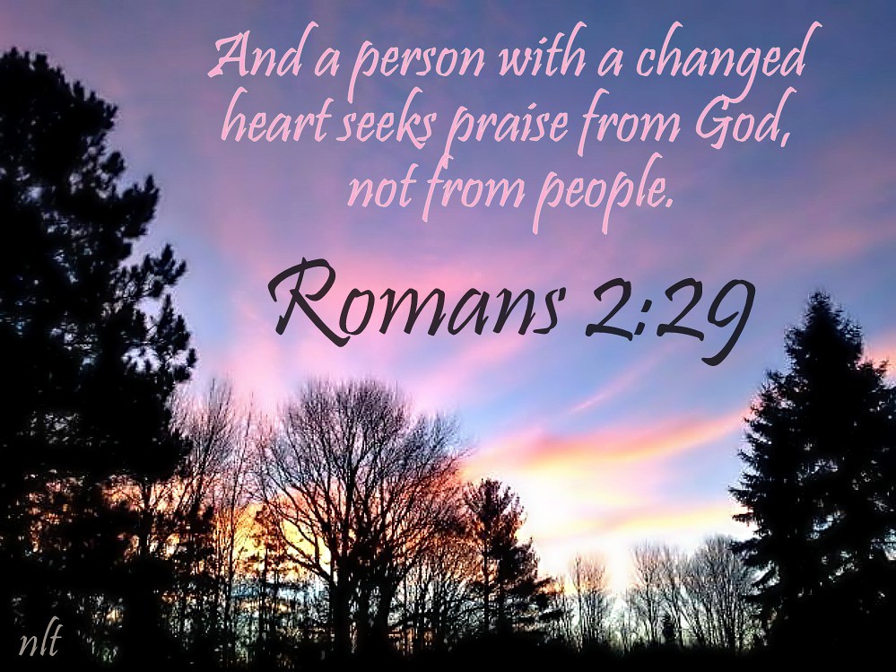 28 A person is not a Jew who is one only outwardly, nor is circumcision merely outward and physical. 29 No, a person is a Jew who is one inwardly; and circumcision is circumcision of the heart, by the Spirit, not by the written code. Such a person’s praise is not from other people, but from God.